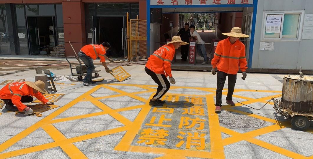 做好前奏的工作,劃線的時(shí)候,把消防通道,禁止占用字樣的模板放到測(cè)好的位置,然后把熱熔涂料涂抹上去,就OK了,是不是和小時(shí)候照著模板畫畫一樣吶。當(dāng)然涂料的調(diào)配,反光玻璃珠施放還是要一定的經(jīng)驗(yàn)知識(shí)和技巧。
