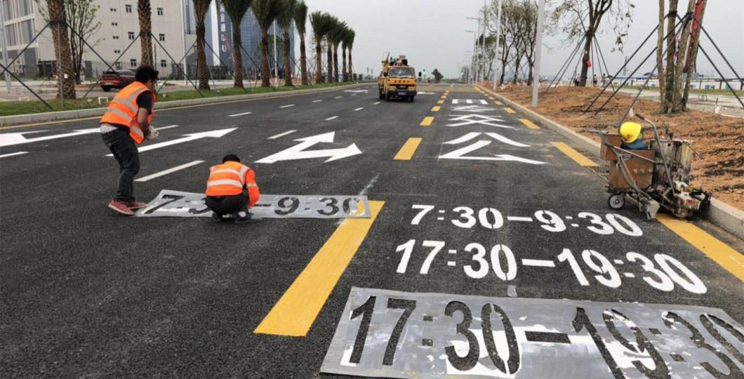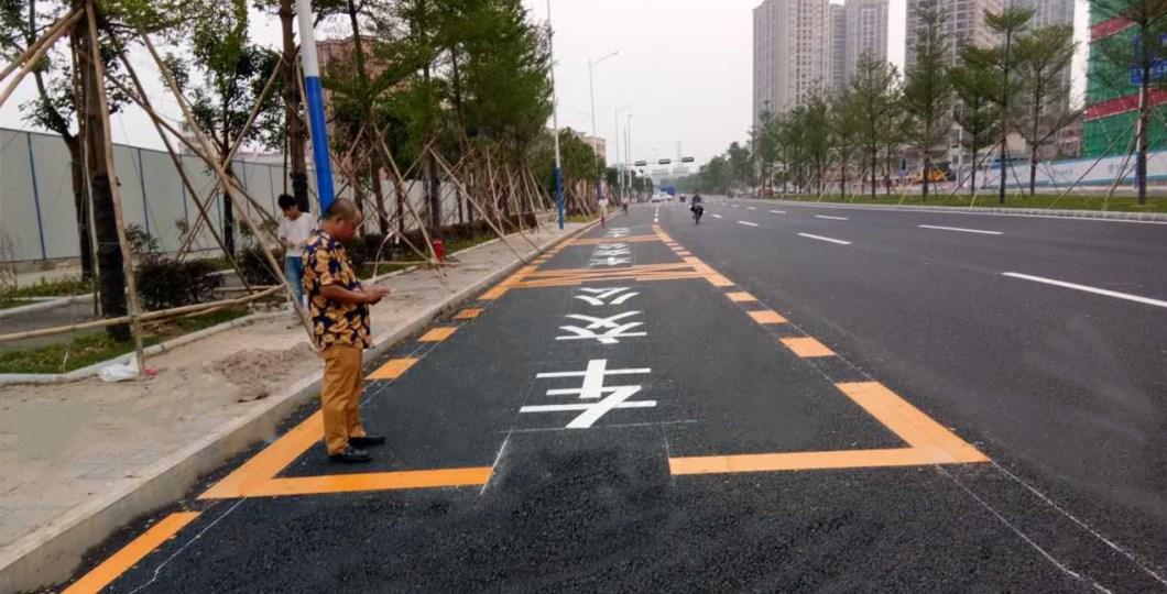 公交專(zhuān)用車(chē)道線由黃色虛線及白色文字組成,黃色虛線的線段長(zhǎng)和間隔為400cm,線寬為20或25cm,表示除公交車(chē)外,其他車(chē)輛及行人不得進(jìn)入該車(chē)道。字體的標(biāo)劃,技術(shù)要好的人員會(huì)自接用手推車(chē)完成,也可以用模板涂敷。